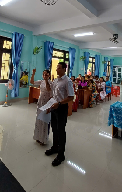 Đ/c Bí Thư Chi bộ Trường TH Lê Hoàn - Hồ Thị Thanh Tình trao Quyết định cho 02 đảng viên mới. Sau nghi thức chào cờ trang nghiêm, Đồng chí Hồ Thị Thanh Tình - Bí thư trường thay mặt Chi ủy đọc Quyết định kết nạp đảng viên đồng thời quán triệt nhiệm vụ, quyền hạn của người đảng viên, nhiệm vụ của Chi bộ, phân công đảng viên chính thức tiếp tục giúp đỡ đồng chí Trần Thanh Dương và Nguyễn Thị Thu Trang trong thời gian đảng viên dự bị, phấn đấu trở thành đảng viên chính thức.